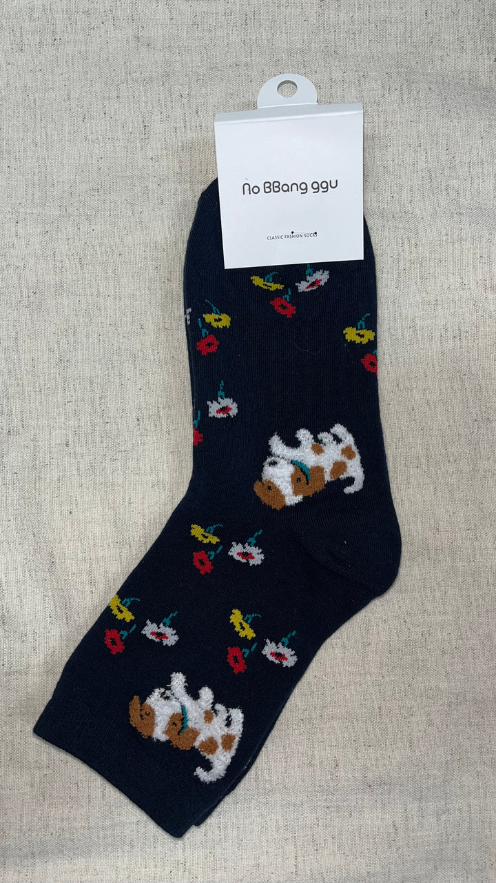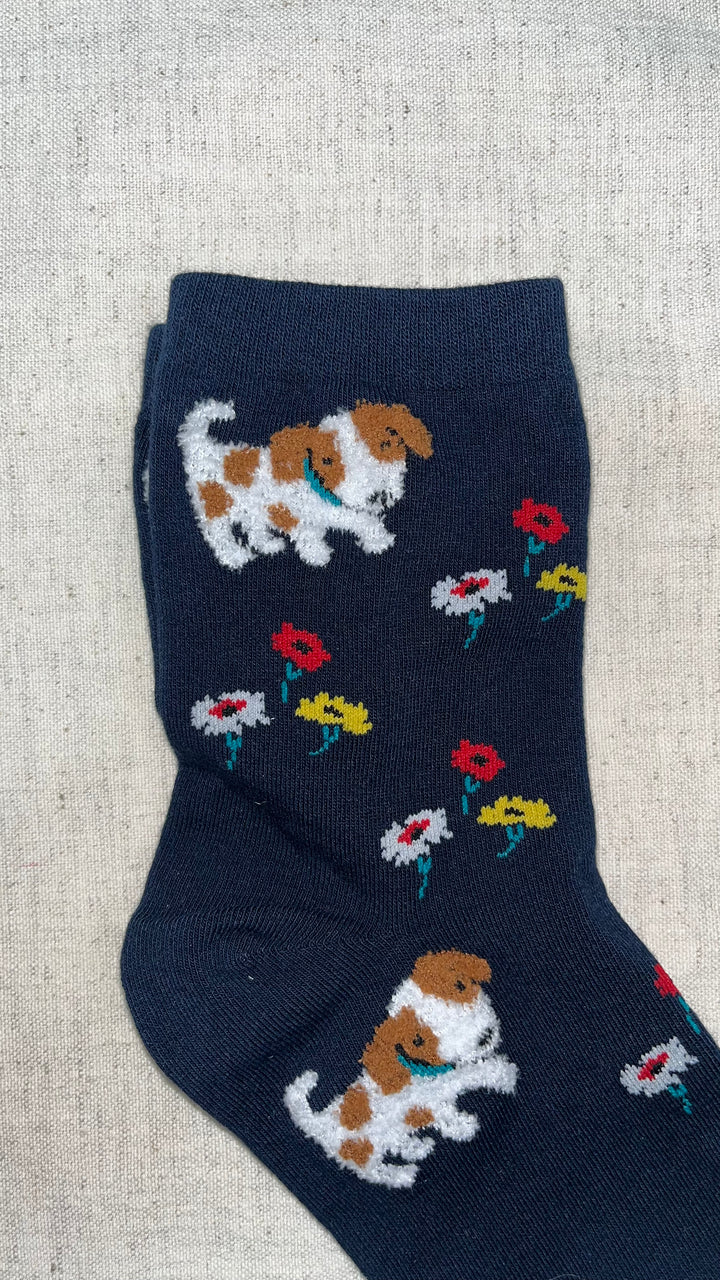 These socks feature a playful puppy design, surrounded by colorful flowers, adding a cheerful vibe to your outfit. The soft fabric ensures comfort throughout the day, making them a fun and cozy addition to your wardrobe.