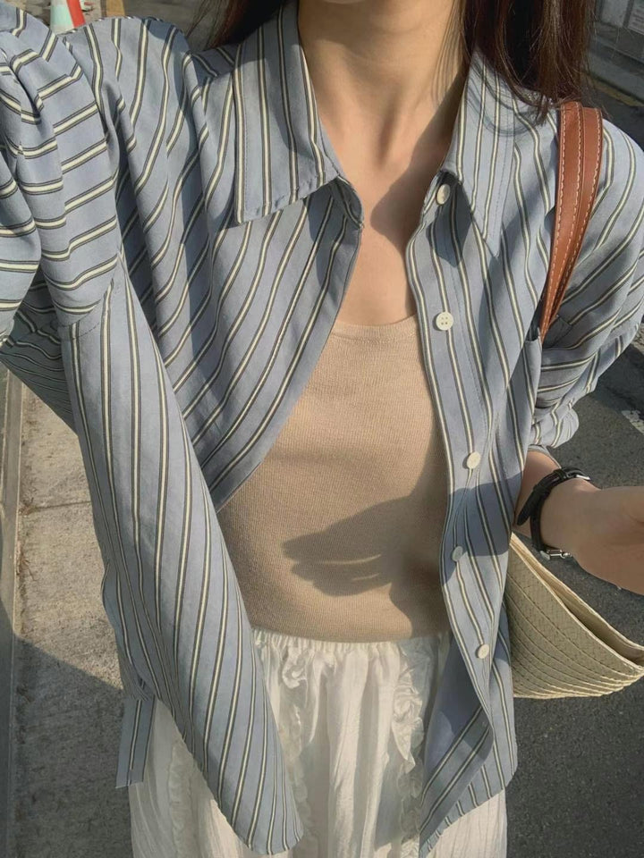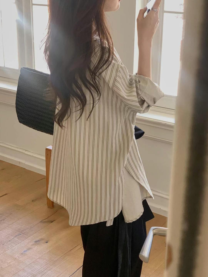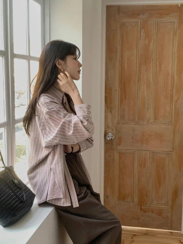 Meet your new favorite layering piece. This relaxed-fit striped button-up is made from soft, breathable cotton that drapes gently over your frame—perfect for those slow mornings, cozy afternoons, or spontaneous coffee strolls. Whether worn open over a tank or buttoned up with wide-leg pants, it brings a sense of effortless charm and quiet comfort to your everyday wardrobe. A timeless touch for when you want to feel at ease, yet beautifully put together.